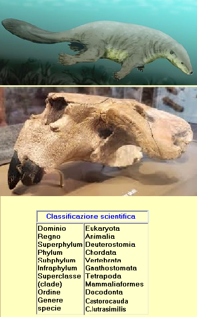 Castorocauda deriva dal latino Castor: castoro e cauda: coda che si presenta simile a quella del castoro, e Lutrasimilis deriva dal latino lutra: lontra e similis: simile, per alcuni aspetti dei suoi denti e delle sue vertebre simili a quelli delle lontre moderne. Con un peso stimato di circa 500-800 g., è il più grande mammifero conosciuto del Giurassico, con pelliccia o adattamenti acquatici. Adattato allo scavo per i suoi denti a vanga, che suggerisce un comportamento simile alle lontre di fiume moderni e che si nutrisse principalmente di pesce. Presenta arti anteriori molto simili a quelli dell'ornitorinco moderno e potrebbe anche averle usato per remare. Tra le dita degli arti posteriori si sono trovate tracce di tessuto molle, suggerendo zampe posteriori palmate, probabilmente munite di artigli. Sulla caviglia posteriore mostra uno sperone che negli ornitorinchi maschi moderni è velenoso. Le vertebre della coda sono appiattite con una anatomia simile a quella dei castori e delle lontre, che usano la coda per pagaiare e per la propulsione. La pelliccia trovata sull'animale fossile è la più antica conosciuta ed ha dimostrato che era già presente nei mammiferi. |