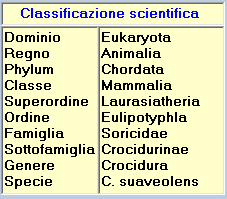 ![]() Nomenclatura binomiale: Crocidura suaveolens ![]() È specie protetta dalla Convenzione di Berna. Convenzione per la conservazione della vita selvatica e dei suoi biotopi in Europa. In Italia è stata recepita con la legge n. 503 del 5agosto 1981 |