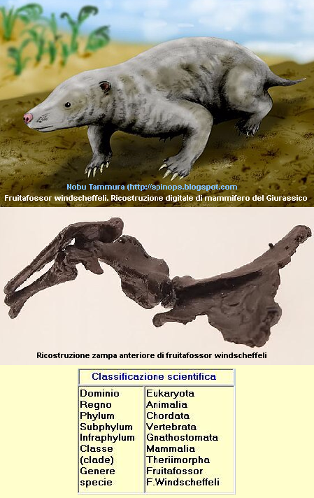 I denti del fruitafossor sono molto simili ai denti degli armadilli e oritteropi attuali: questo tipo di dentatura (radice aperta a forma di matita e senza lamella, indica una nutrizione altamente specializzata, a base di insetti coloniali (mirmecofagia). Si pensa che si nutrisse quasi esclusivamente di termiti, abbondanti in quel periodo. Fu soprannominato Braccio di ferro per gli arti anteriori robustissimi che utilizzava per scavare tane sotto terra in cui viveva. Aveva la colonna vertebrale molto simile a quella degli armadilli, dei bradipi e dei formichieri. Questo ritrovamento fu molto importante nell'ottica dell'evoluzione dei mammiferi; fino a pochi anni fa si pensava che quasi tutti i mammiferi mesozoici fossero insettivori poco specializzati. Fruitafossor dimostrò che i mammaliaformi primitivi non fossero relegati a una singola nicchia ecologica, ma durante il Giurassico e il Cretaceo si specializzarono in varie direzioni. Il fruitafossor non ha parenti attuali, e può essere considerato un membro primitivo della sottoclasse che contiene marsupiali e placentali. Il suo cinto scapolare è simile a quello dei rettili e dell'ornitorinco, ma molte altre caratteristiche lo avvicinano maggiormente ai mammiferi più evoluti. Si pensa sia stato tra i primi rappresentanti della linea evolutiva che ha condotto ai mammiferi viventi.. | ![]() |