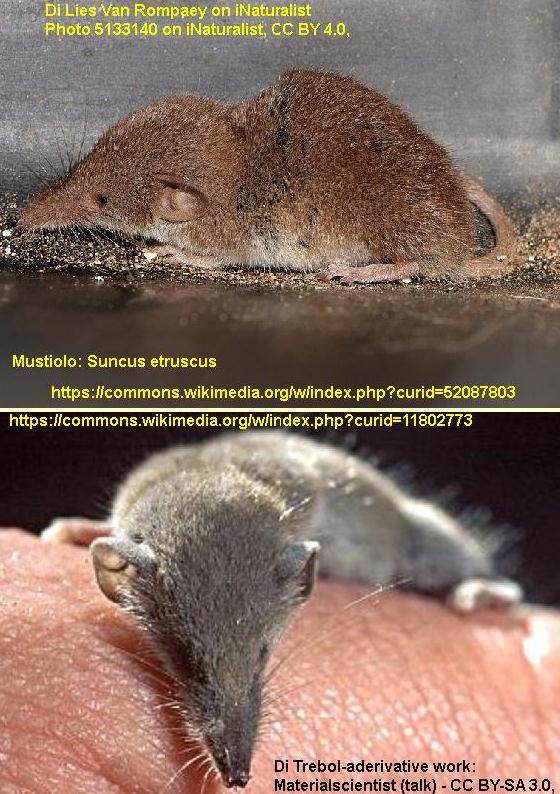 Il Mustiolo è presente in quasi tutti i paesi dell Mediterraneo. In Europa è stato segnalato in Svizzera, nel sud della Francia, nella penisola iberica e nei Balcani e in Turchia. In Italia è presente in quasi tutta la penisola, (meno che nei rilievi alpini) compresa Sicilia e anche in Sardegna, dove, in particolare, è presente una sottospecie endemica, Suncus etruscus pachyurus (Küster, 1835). Questi piccoli mammiferi hanno abitudini molto discrete e parzialmente notturne. Trascorrono le 24 ore alternando periodi di riposo e di attività. Per questo sono praticamente invisibili nel loro ambiente naturale della gariga, fatto di cespugli, ammassi di rami e foglie ai bordi di vecchi muri o mucchi di pietre. Amano molto il caldo perchè è una condizione indispensabile per la loro vita. Infatti, non sopravvivono a temperature inferiori ai 15 °C o a mancanza di nutrimento per pochissimo tempo. Sono animali innocui e utili all’uomo specialmente nell’agricoltura. In natura. questa specie, ha una aspettativa di vita da uno a due anni. Nonostante la loro piccola taglia, sono affamati carnivori e attaccano tutte le prede più piccole della loro taglia (lombrichi, insetti vari, artropodi e piccoli invertebrati), che riescono a individuare. Il mustiolo individua le prede a 25–30 cm di distanza: si precipita sulla vittima, mordendola ferocemente. Divora le parti vulnerabili e molli, abbandonando i resti e riparte alla ricerca di una nuova vittima. Rifiuta insetti come le cimici, e indietreggia davanti a prede troppo grandi per la sua taglia. La riproduzione avviene, anche più volte, nella stagione calda, dalla primavera all'autunno (marzo – ottobre). Le femmine costruiscono un nido, utilizzato solo per la riproduzione, foderato con erba, muschio e foglie. Dopo circa 28 giorni di gestazione, nascono da 2 a 5 piccoli interamente nudi di colore rosa carico, che pesano solo 2 gr. e, dopo circa 20-22 giorni, diventano indipendenti dai genitori. ![]() |